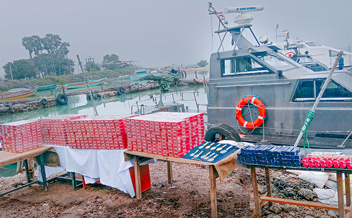 ශ්රී ලංකා නාවික හමුදාව, යාපනය ඩෙල්ෆ්ට් දකුණු මුහුදු ප්රදේශයේ 2025 දෙසැම්බර් මස 03 වැනි දින සිදුකළ විශේෂ සෝදිසි මෙහෙයුමක් මඟින්, නීතී විරෝධී ලෙස මෙරටට රැගෙන ඒමට උත්සාහ කල විදේශීය දුම්වැටි එක්ලක්ෂ හැටදහසක (160,000) පමණ තොගයක් සමඟ රූපල...
