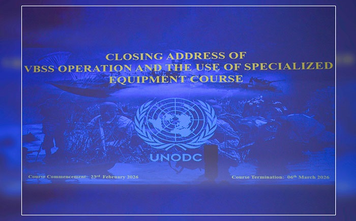 එක්සත් ජාතීන්ගේ මත්ද්රව්ය හා අපරාධ මැඩපැවැත්වීම සම්බන්ධ කාර්යාලය මඟින් (United Nations Office on Drugs and Crime - UNODC). ත්රීකුණාමලය, විශේෂ යාත්රා බලඝණ මූලස්ථානයේදී පවත්වන ලද යාත්රාවන් වෙත ප්රවිශ්ඨවීම, සෝදිසි කිරීම සහ අත්පත් කරගැනීමේ ක්රමවේදයන් සම්බන්ධ කලාපීය පුහුණු පාඨමාලාව සහ විශේෂිත උපකරණ පරිහරණය පිළිබඳ පුහුණු පාඨමාලාව සාර්ථකව අවසන් වූ අතර, එහි සහතික ප්රධානය, 2026 මාර්තු මස 06 වැනි දින විශේෂ යාත්රා බලඝණ මූලස්ථානයේදී සිදුකෙරිණි.
