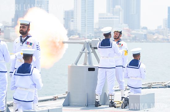 துப்பாக்கி சூட்டு வணக்கத்தின் போது அதிகபட்சமாக 25 துப்பாக்கிச் சூடுகள் சுடப்படலாம், இது தேசத்திற்கு ஒரு வணக்கம், மேலும் துப்பாக்கி சூட்டு வணக்கங்களின் பாரம்பரியம் 14 ஆம் நூற்றாண்டிலிருந்து நீண்ட வரலாற்றைக் கொண்டுள்ளது. இலங்கை கடற்படை வரலாற்றில் முதல் சுதந்திர தின துப்பாக்கி சூட்டு வணக்கம் 1948 ஆம் ஆண்டு காலி முகத்திடலில் அரச கடற்படையால் நிகழ்த்தப்பட்டது. அதன்படி, இலங்கை சுதந்திரம் பெற்ற 1948 பெப்ரவரி 4 ஆம் திகதி முதல், தேசத்திற்கு மரியாதை செலுத்தும் வகையில் 25 துப்பாக்கி சூட்டு வணக்கங்களைச் செலுத்தும் பாரம்பரியத்தை கடற்படை தொடர்கிறது, மேலும் 2021 முதல், தேசத்திற்கான 25 துப்பாக்கி சூட்டு வணக்கங்கள் ஒரு கப்பலில் இருந்து தொடங்கியது.