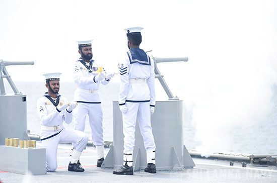 துப்பாக்கி வணக்கத்தின் போது, கடற்படை பாரம்பரியமாக கப்பலின் கம்பங்களை கொடிகளில் இருந்து படிக்கப்படும் ஆங்கில எழுத்துக்கள் மற்றும் எண்களைப் பயன்படுத்தி ‘25 Gun Salutes for the Nation’ என்ற செய்தியைப் படிக்க அலங்கரித்தது.
