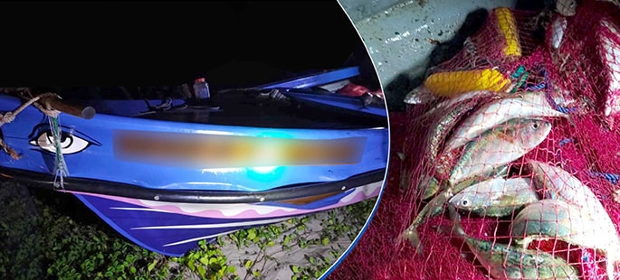 A search operation conducted by the Navy off Kokilai, Pulmude on 27th July 2023, led to the apprehension of 03 persons who were engaging in illegal fishing activities. During this operation, the Navy also held 01 dinghy, a stock of illegally caught fish and unauthorized fishing gear used for the illegal act.