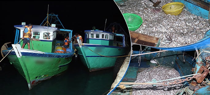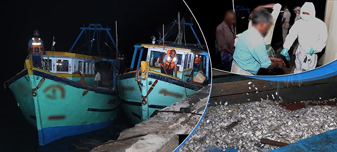 The Sri Lanka Navy and Coast Guard conducted a special operation to chase away Indian poaching trawlers from Sri Lankan waters in the dark hours of 08th July 2023. The operation led to the apprehension of 02 Indian trawlers with 15 Indian nationals poaching in Sri Lankan waters off the Delft Island, Jaffna.