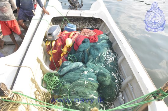 A naval patrol craft attached to SLN Dockyard of the Eastern Naval Command arrested 06 persons engaged in illegal fishing in the general area of Upparu in Trincomalee on 21st January 2015. They had been fishing using an illegal purse seine net when they were arrested by the naval craft on routine patrol.