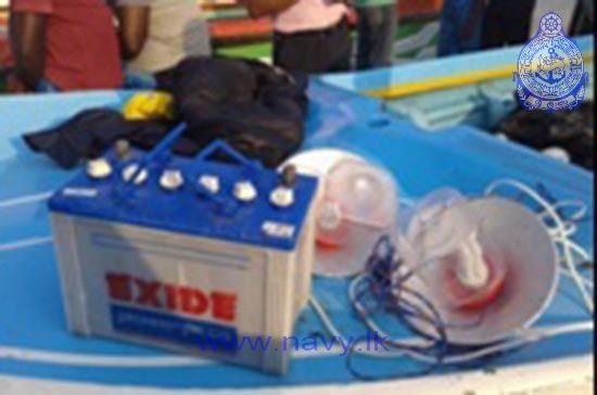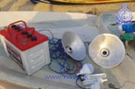 Naval personnel attached to Naval Deployment Batticaloa of the Eastern Naval Command with the assistance of the Fisheries Inspector (Batticaloa) arrested 06 persons with 02 FGDs engaged in illegal fishing in the general area of Punnakudah in Eraur on 19th March 2015. They were arrested by Naval personnel on the suspicion of using light course for fishing since there had been two large batteries, 08 CFL bulbs and two fishing nets were in their possession at the time of arrest.